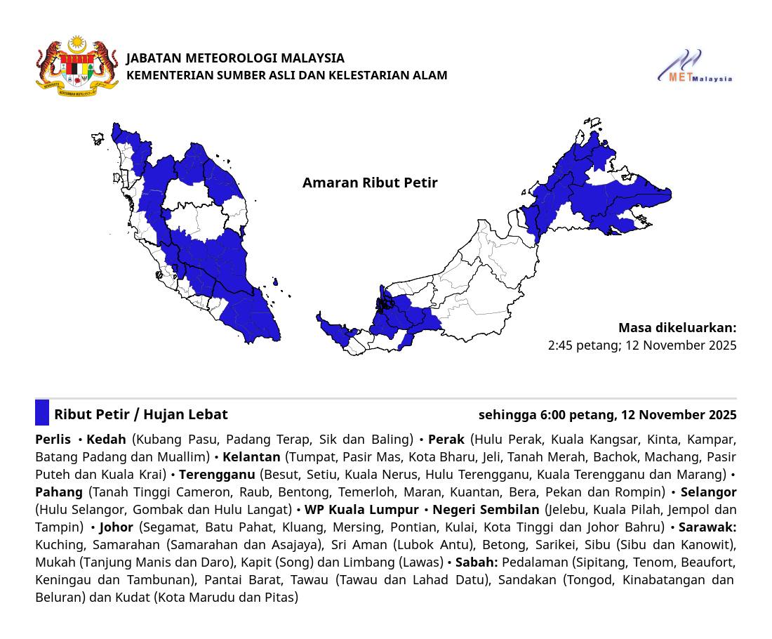 吉打、霹雳、吉兰丹、登嘉楼、彭亨、森美兰、柔佛,以及东马沙巴与砂拉越的局部地区预计有雷雨来袭,直至今日傍晚6时。