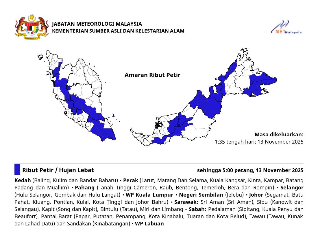 马来西亚气象局于今日下午1时35分在官方脸书更新天气预告时表示,雪州受影响的地区包括乌鲁雪兰莪、鹅唛和乌鲁冷岳,整个吉隆坡和纳闽也预计受到恶劣天气的影响。