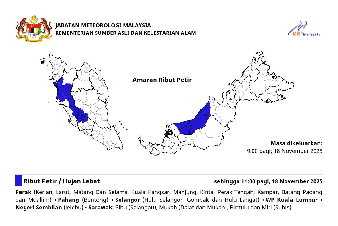(莎阿南18日讯)雷雨来袭!雪兰莪3个县区、吉隆坡与数个州属预计迎来雷雨天气,直至今日上午11时。