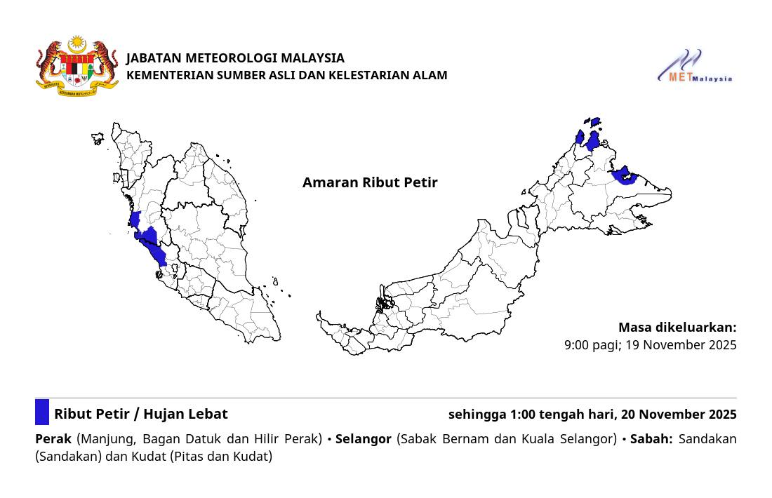 (莎阿南18日讯)雪兰莪州沙白安南县和瓜拉雪兰莪县,预计有雷暴、大雨和强风至今午1时。马来西亚气象局今早9时更新天气预告说,霹雳和沙巴,也是局部地区有雷雨。当雷暴迹象及降雨量超过每小时20毫米(mm/小时),或预计超过一小时,当局就会发出警告。