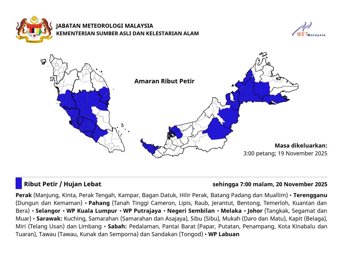 此外,霹雳、登嘉楼、彭亨、柔佛、沙巴和砂拉越,则有局部地区预计迎来狂风暴雨,直至今日傍晚7时。