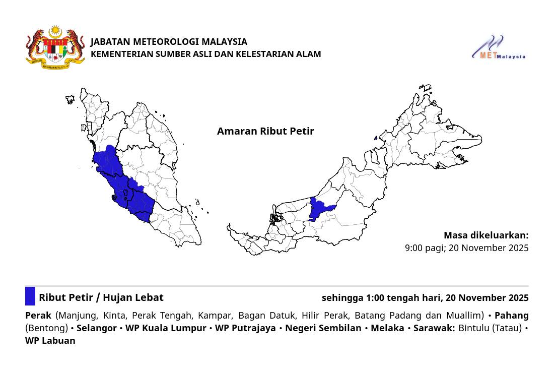 马来西亚气象局于今日上午9时在官方脸书更新天气预报时表示,整个雪州,包括乌鲁雪兰莪、瓜拉雪兰莪、瓜拉冷岳、乌鲁冷岳、雪邦、鹅唛、八打灵、沙白安南和巴生,以及整个吉隆坡、布城、森美兰、马六甲和纳闽预计受到恶劣天气的影响。