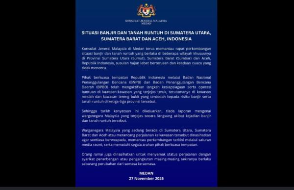 (吉隆坡27日讯)马来西亚驻印尼棉兰总领事馆证实,目前没接获马来西亚公民在北苏门答腊省、西苏门答腊省和亚齐省的水灾和土崩事故受直接影响的报告。