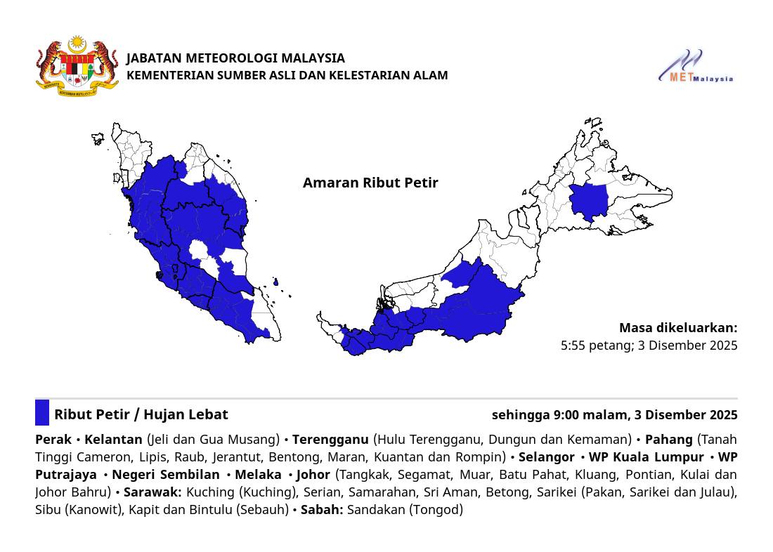 马来西亚气象局更新天气预告说,雷暴警告也出现在整个霹雳、森美兰和马六甲。