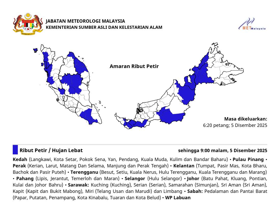 整个槟城和纳闽也受到恶劣的天气影响;至于吉打、霹雳、吉兰丹、登嘉楼、彭亨、柔佛、砂拉越和沙巴则是局部地区会有雷雨直至今晚9时。