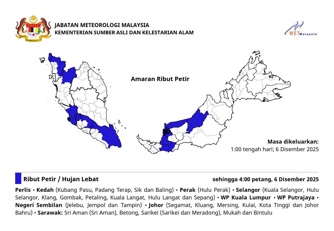 整个玻璃市、吉隆坡、布城将受到恶劣的天气影响;至于吉打、霹雳、森美兰、柔佛和砂拉越则是局部地区会有雷雨直至今日下午4时。