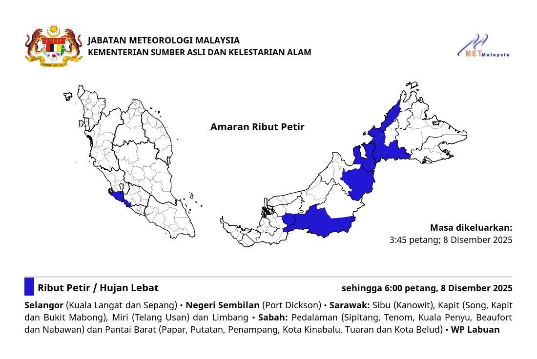 马来西亚气象局于今日下午3时45更新天气预告时表示,除了雪州的瓜冷和雪邦外,整个纳闽、森美兰、砂拉越和沙巴局部地区也预计有雷雨天气,直至今日傍晚6时。