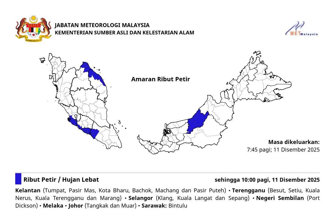 (莎阿南11日讯)雪兰莪州3个县区预计迎来雷雨天气,直至今日上午10时。