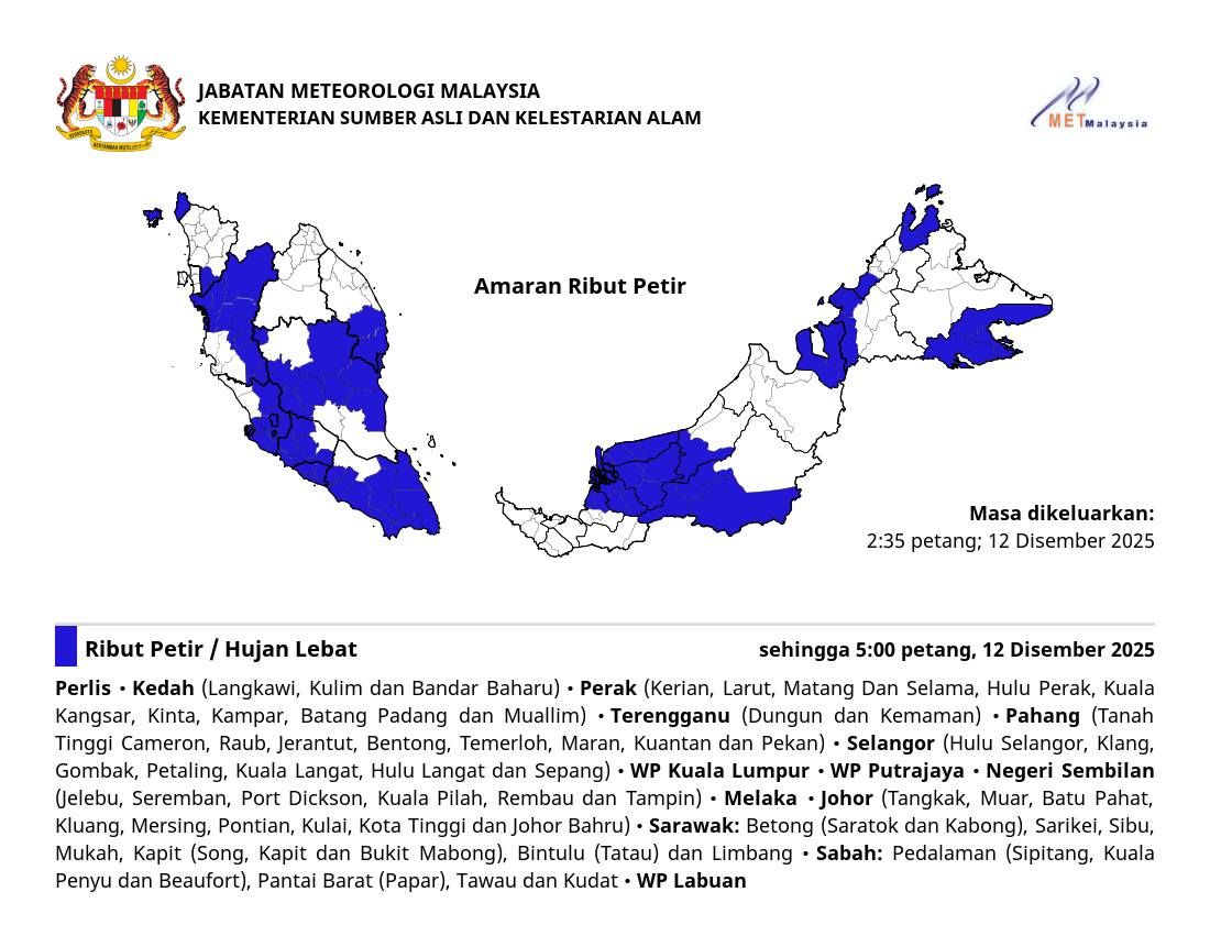 (莎阿南12日讯)狂风暴雨来袭!全国多个州属包括雪兰莪、吉隆坡和布城预计迎来雷雨直至今日下午5时。