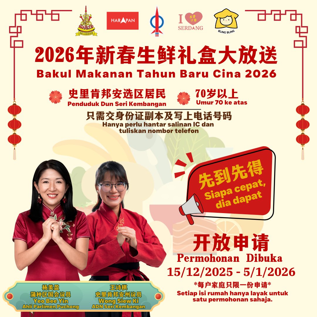 另一方面,王诗棋指出,沙登农历新年生鲜礼盒同样已开放申请,申请者必须是居住在史里肯邦安区的本区选民、年满70岁或以上,以及同一住址仅限申请一份(以身份证地址为准)。