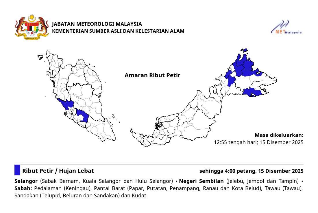 大马气象局于今日中午12时55分在官方脸书更新天气预告时表示,雪州受影响的地区包括沙白安南、瓜拉雪兰莪和乌鲁雪兰莪;森美兰和东马沙巴则是局部地区预计受到恶劣天气的影响。