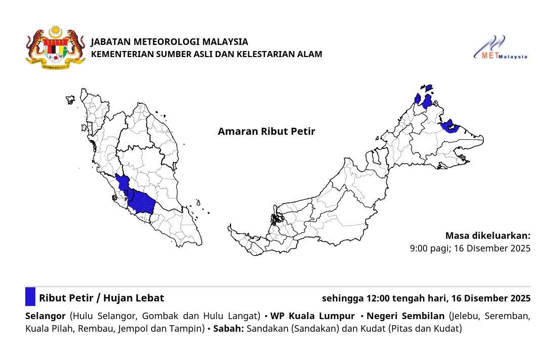(莎阿南16日讯)马来西亚气象局预警,雪兰莪州3个县区和吉隆坡将迎来雷雨天气至中午12时。