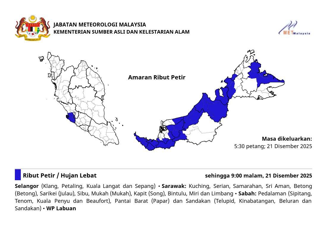 马来西亚气象局于今日下午5时30分在官方脸书更新天气预告时表示,雪州受影响的地区有巴生、八打灵、瓜拉冷岳和雪邦。