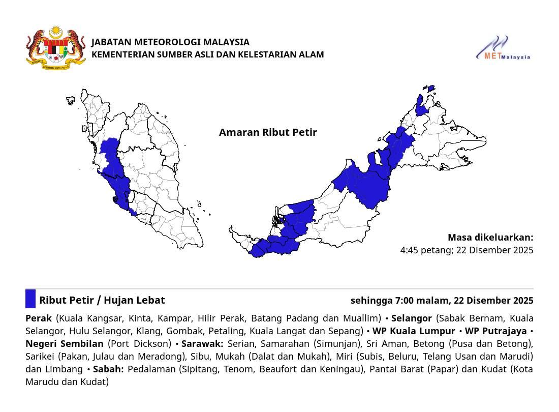 (莎阿南22日讯)准备下班的各位注意咯!马来西亚多个州属包括雪兰莪和吉隆坡预计将迎来雷雨直至今日晚上7时。