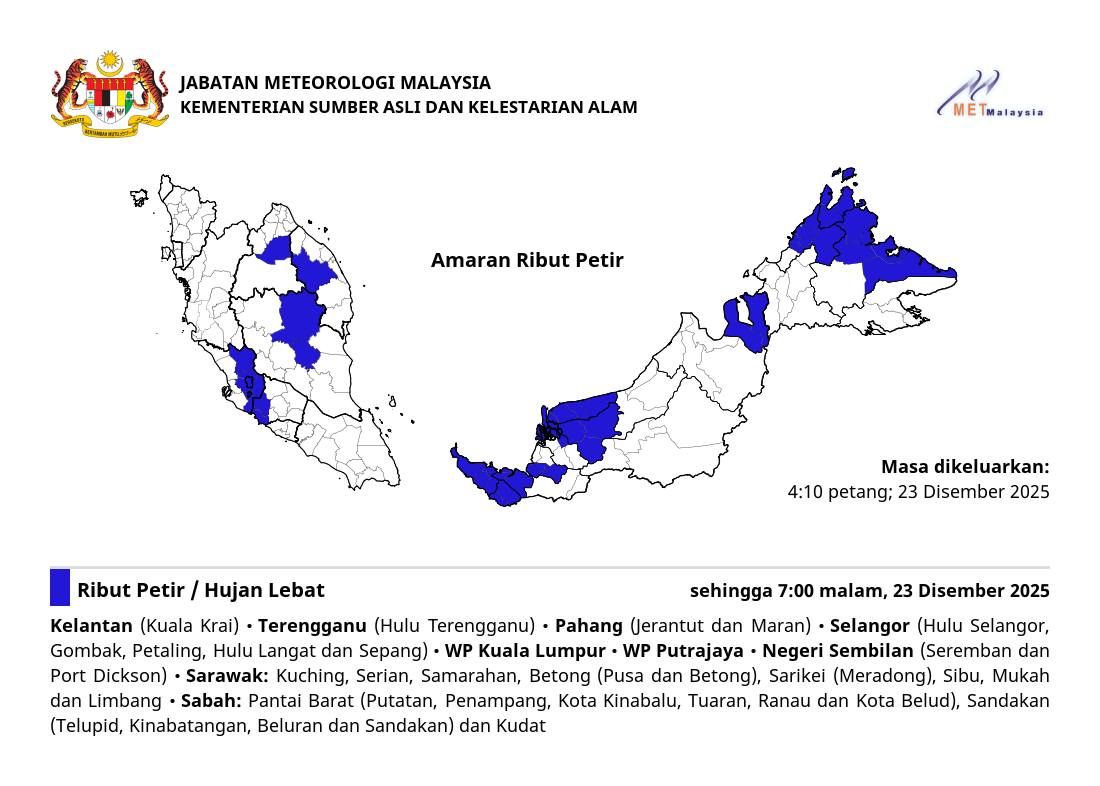 (莎阿南23日讯)准备放工的上班族记得带伞!马来西亚多个州属包括雪兰莪和吉隆坡,预计将迎来雷雨天气,直至今日晚上7时。