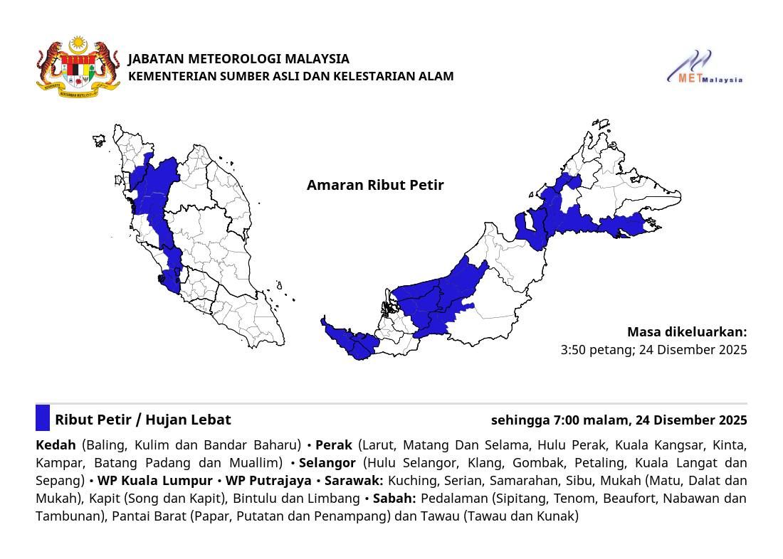 (莎阿南24日讯)平安夜迎雷雨!马来西亚多个州属包括雪兰莪和吉隆坡,预计将迎来雷雨天气,直至今日晚上7时。