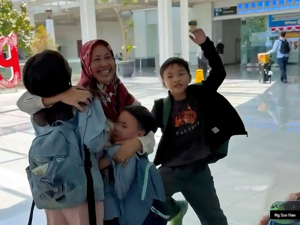 黄思汉周五在脸书分享视频,记录全家飞往印尼中爪哇,与服务其家庭长达25年的前女佣莉娜久别重逢的温馨画面。视频中,当孩子们在机场一见到熟悉的莉娜,毫不犹豫地飞奔上前紧紧相拥。这位陪伴黄思汉家庭四分之一世纪的“功臣”,看着昔日拉扯大的五个孩子,脸上写满慈爱,连声说到孩子“长高了”。