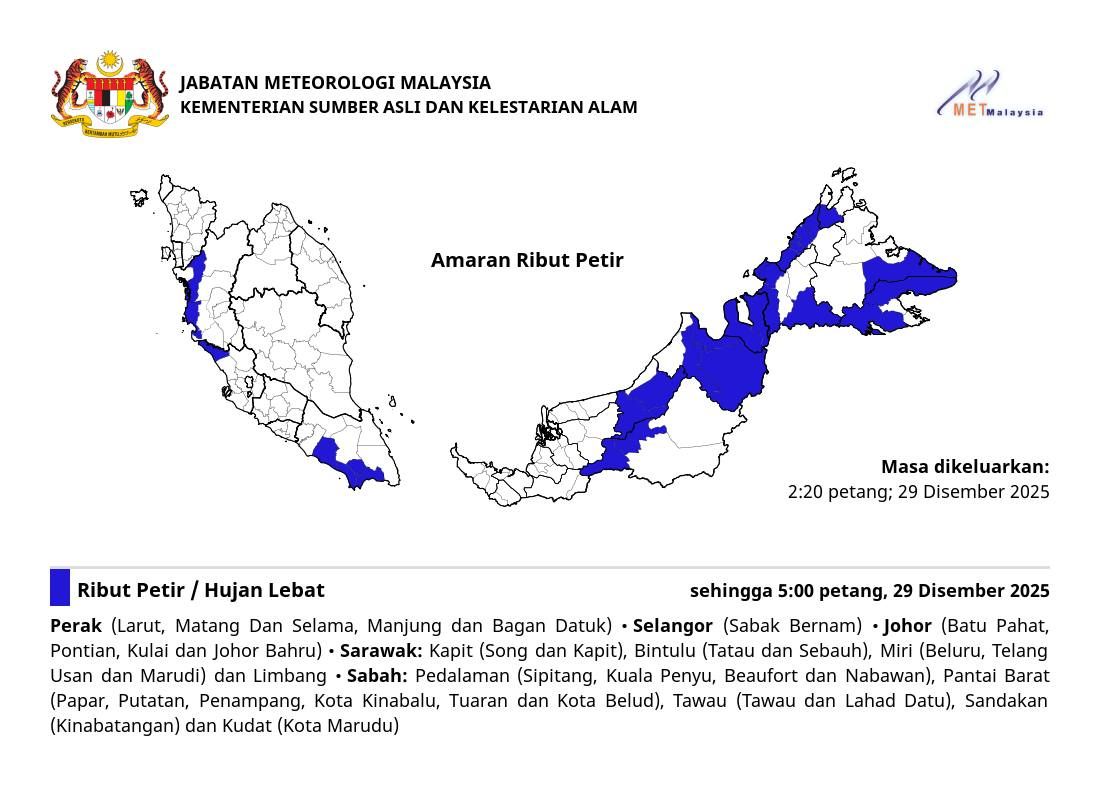 马来西亚气象局于今日下午2时20在官方脸书更新天气预报时表示,雪兰莪的沙白安南县预计迎来雷雨天气,霹雳、柔佛,东马砂拉越和沙巴则是局部天气预计有雷雨来袭,直至下午5时。