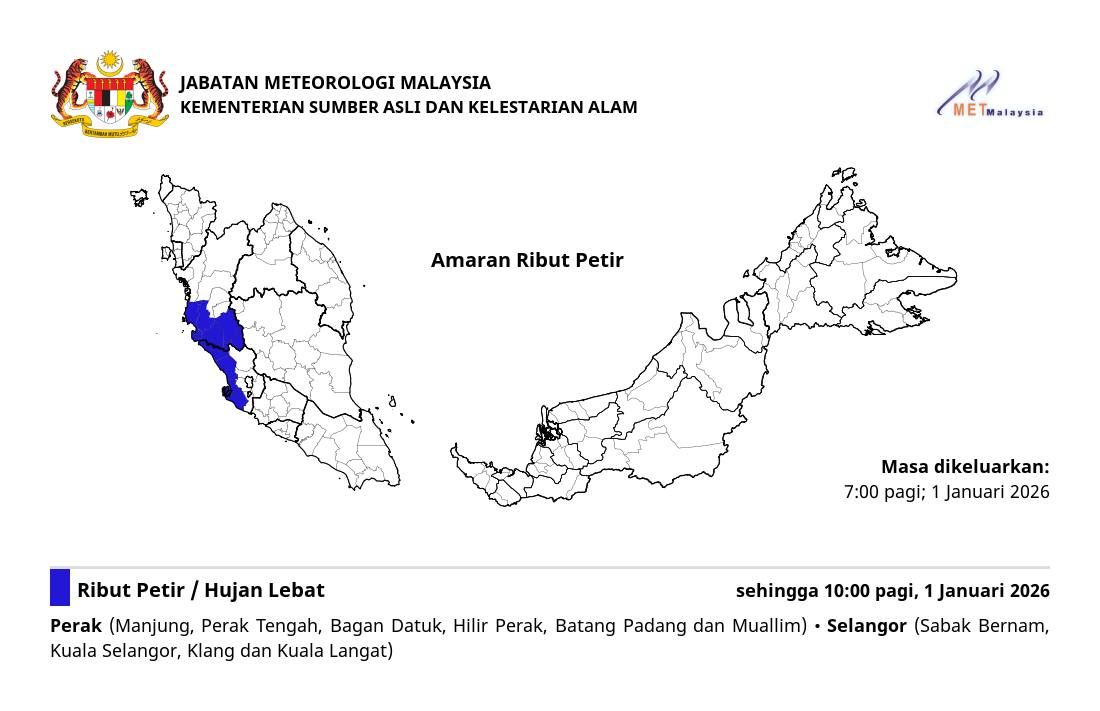 马来西亚气象局于今日清晨7时分通过官方脸书更新天气预告时表示,雪兰莪受影响的县区包括沙白安南、瓜拉雪兰莪、巴生和瓜拉冷岳,而霹雳则是曼绒、中霹雳、峇眼拿督、下霹雳、巴登峇当和慕亚林县,预计出现雷雨天气。
