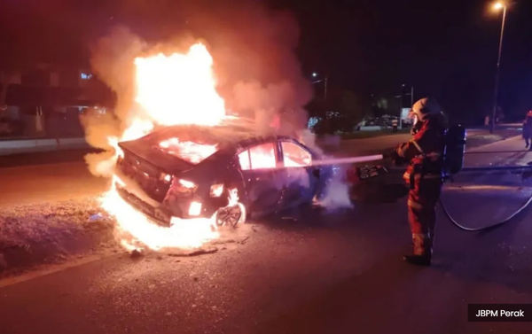 (怡保6日讯)一辆轿车凌晨疑失控撞上电线杆后起火,所幸车上的一家三口包括一名婴儿皆及时逃命,仅受轻伤。