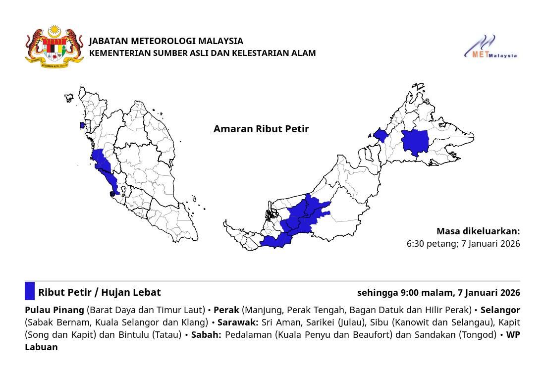 雷暴警告也出现在整个纳闽,至于槟城、霹雳、砂拉越及沙巴,只是局部地区有雨至今晚9时。