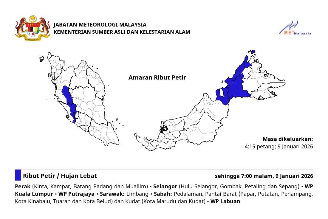 马来西亚气象局官方脸书发布天气预告说,雪州涉及乌鲁雪兰莪、鹅唛、八打灵和雪邦。