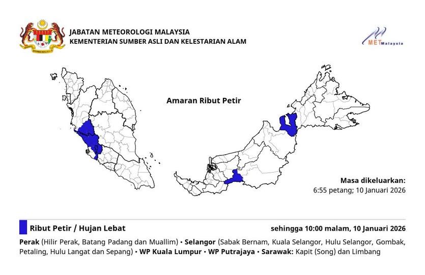 (莎阿南10日讯)雪兰莪多个地区,以及吉隆坡与布城,预计有雷暴警告至今晚10时。