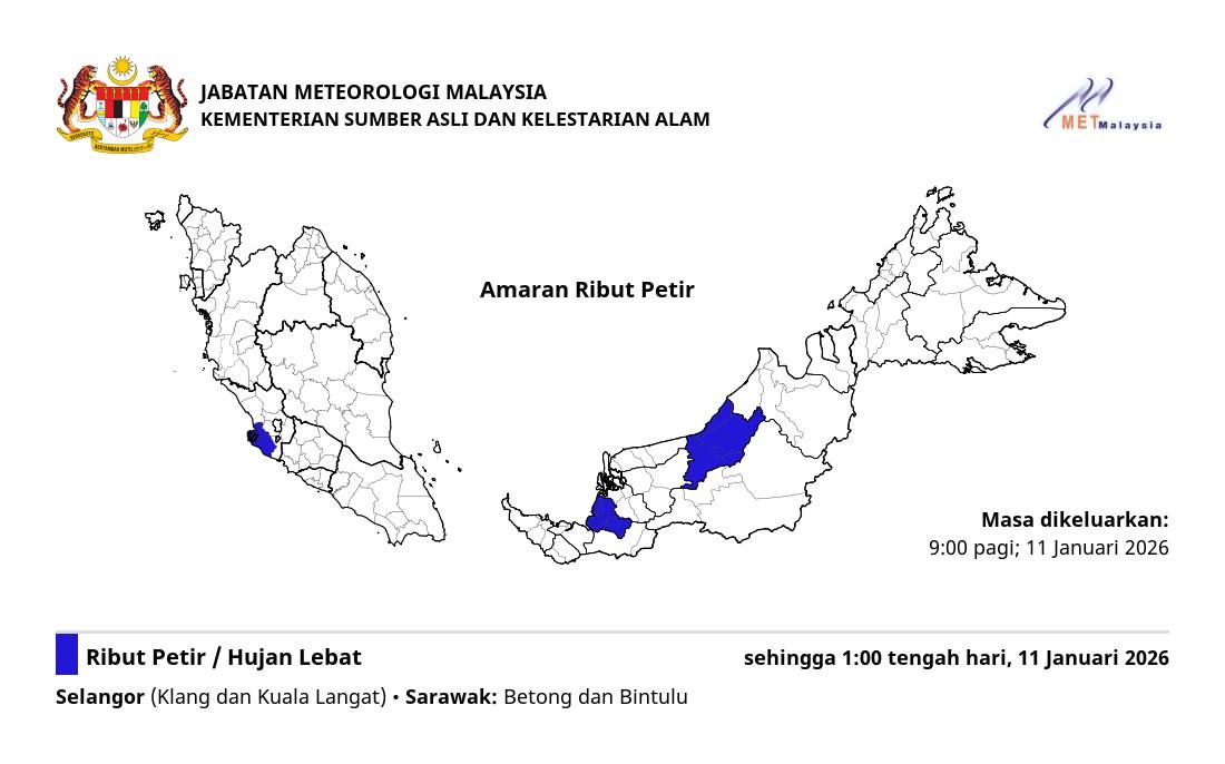 马来西亚气象局于今日上午9时在官方脸书更新天气预报时表示,雪州受影响的地区包括巴生和瓜拉冷岳。