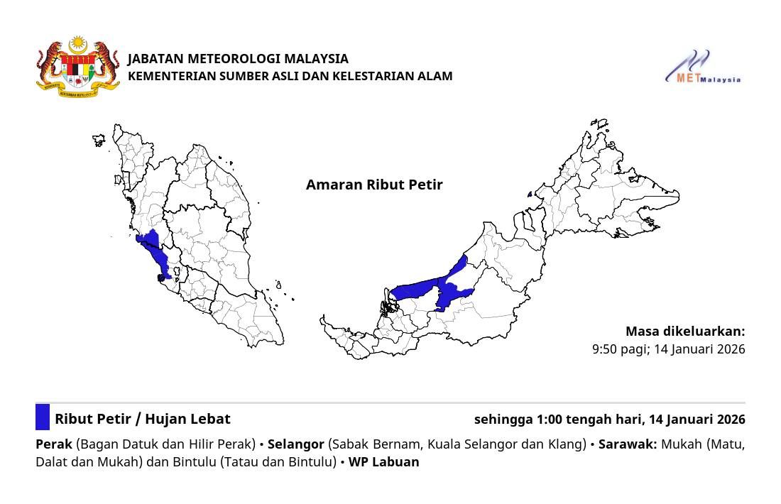 (莎阿南14日讯)雪兰莪数地区有雷暴警告至今日下午1时,料出现雷暴、强风与大雨。