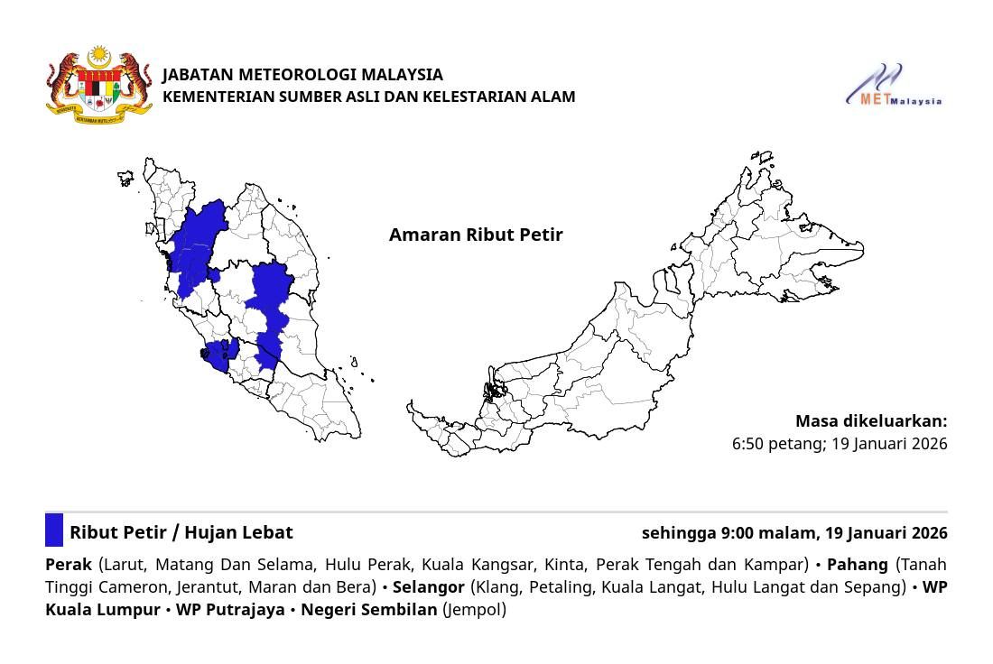 马来西亚气象局更新天气预告说,雪州涉及的县包括巴生、八打灵、瓜拉冷岳、乌鲁冷岳和雪邦。