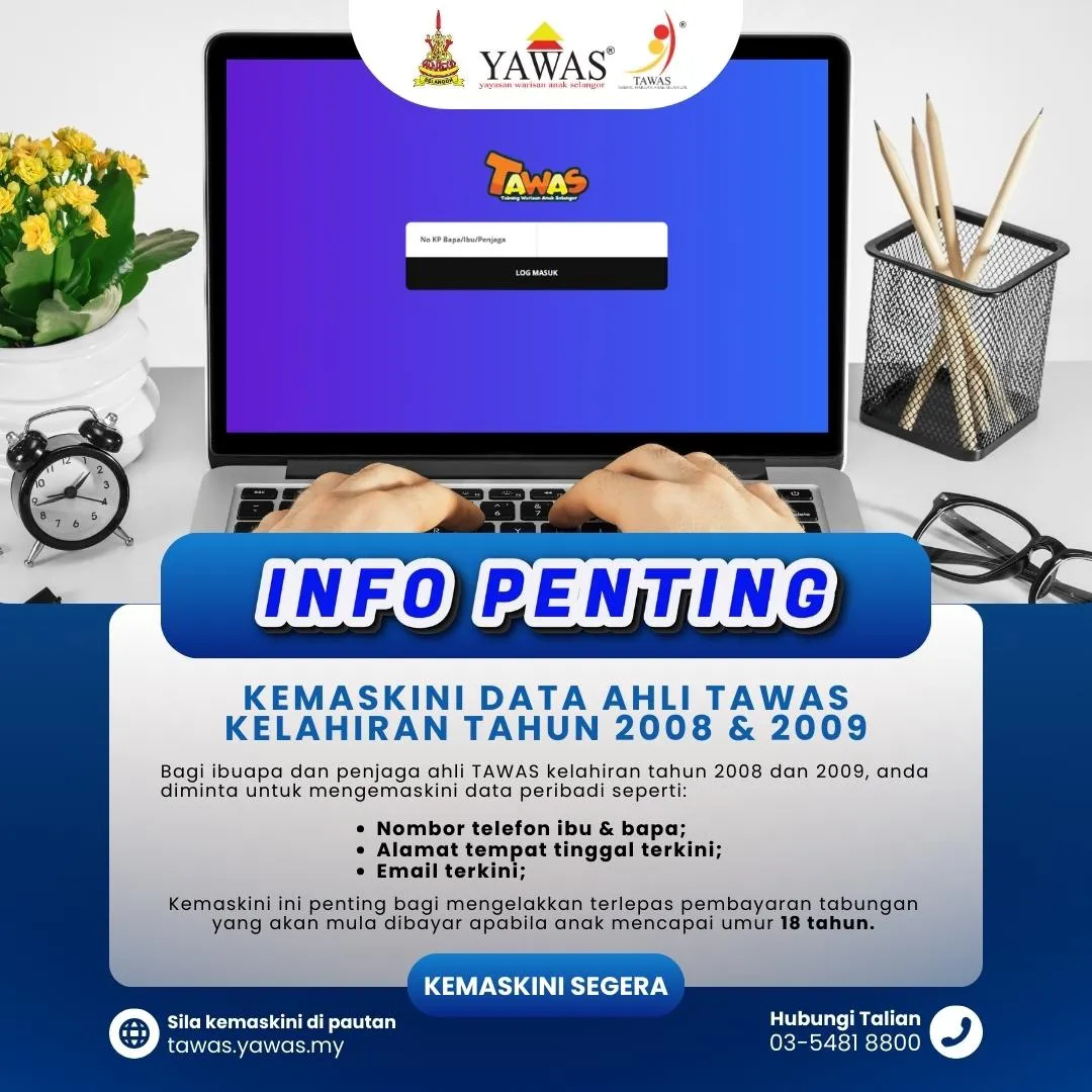 (莎阿南25日讯)雪兰莪州新生儿基金(TAWAS)2008年和2009年出生的会员家长及监护人请注意!立即更新个人信息,确保孩子满18岁时,顺利领取1500令吉教育基金。