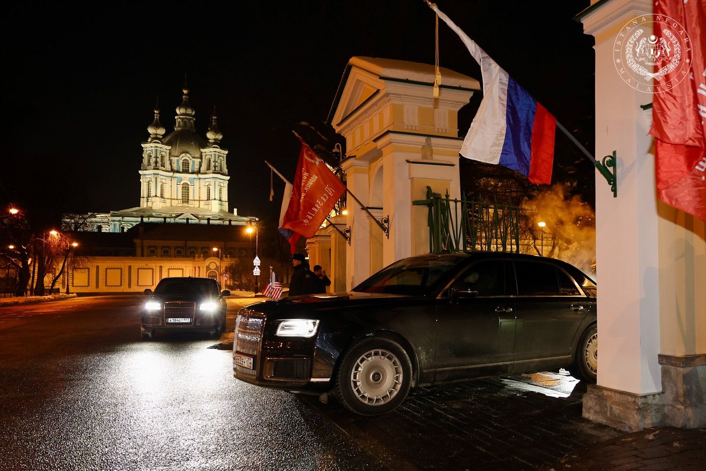 陛下官方面子书发文指出,陛下抵达现为圣彼得堡市政行政中心的斯莫尔尼宫时,获得圣彼得堡市长亚历山大别格洛夫、圣彼得堡对外关系委员会主席格里戈里耶夫等人接待。