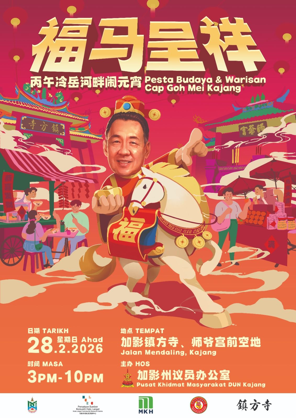 (莎阿南7日讯)加影州议员张睷洋服务中心将于2月28日(星期六)在加影镇方寺与师爷宫前空地举办“福马呈祥,丙午冷岳河畔闹元宵”,以结合佳节喜庆氛围、精彩文化表演与社区力量融为一体,打造一场充满年味与人情味的文化盛会。