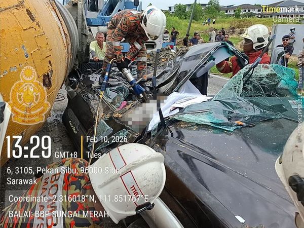 (诗巫11日讯)诗巫德雄路(Jalan Deshon)昨日一辆水泥搅拌车疑似刹车失灵撞四驱车,一名男子身亡。