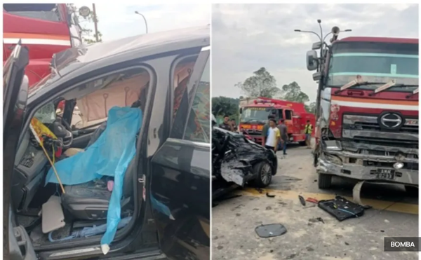 “这起车祸涉及一辆宝马(BMW)豪车与一辆当时没有运载货物的载沙罗里,受困驾驶座的53岁轿车女司机刘海茗(译音)当场毙命,另一名身份待查的女子则受困在轿车后座,身受重伤,至于罗里司机则无大碍。”.