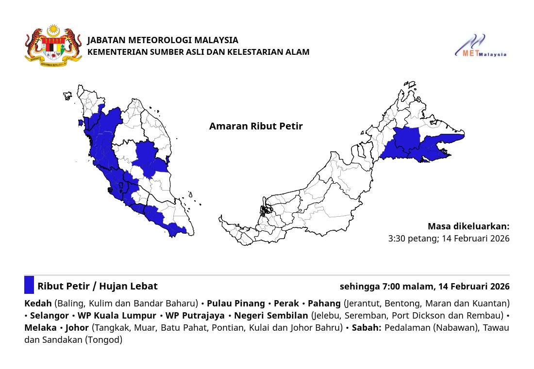 (莎阿南14日讯)整个雪兰莪、吉隆坡与布城,预计有雷暴、强风和大雨出现,直至今日晚上7时。