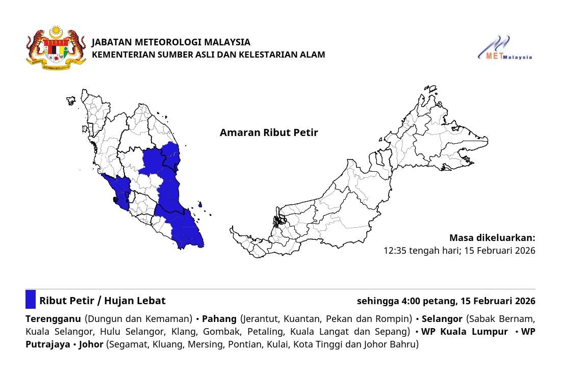 整个吉隆坡和布城也预计迎来雷雨交加的天气;至于登嘉楼、彭亨和柔佛则是局部地区会有雷雨,直至今日下午4时。