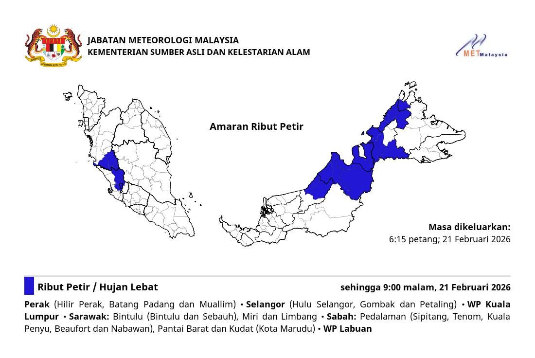 马来西亚气象局于今日下午5时05在官方脸书更新天气预报时表示,雪州受影响的地区有乌鲁雪兰莪、鹅唛和八打灵。