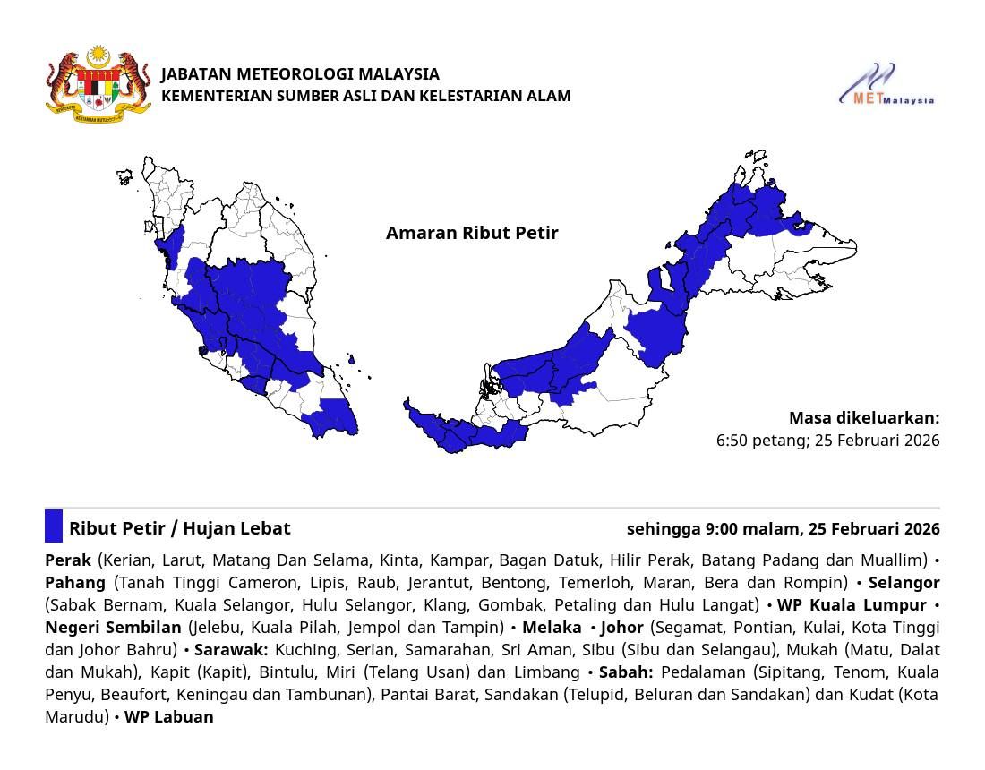 (吉隆坡25日讯)雪兰莪、吉隆坡和8个州属和直辖区,预计持续迎来狂风暴雨,直至今日晚上9时。