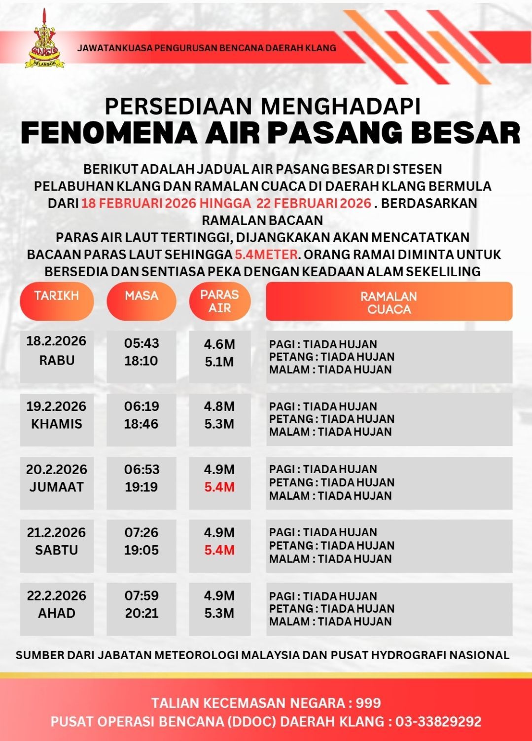 民众若在此期间遇到紧急情况,可拨打国家紧急热线999,或联系巴生县土地局灾难中心,电话:03-3382 9292。