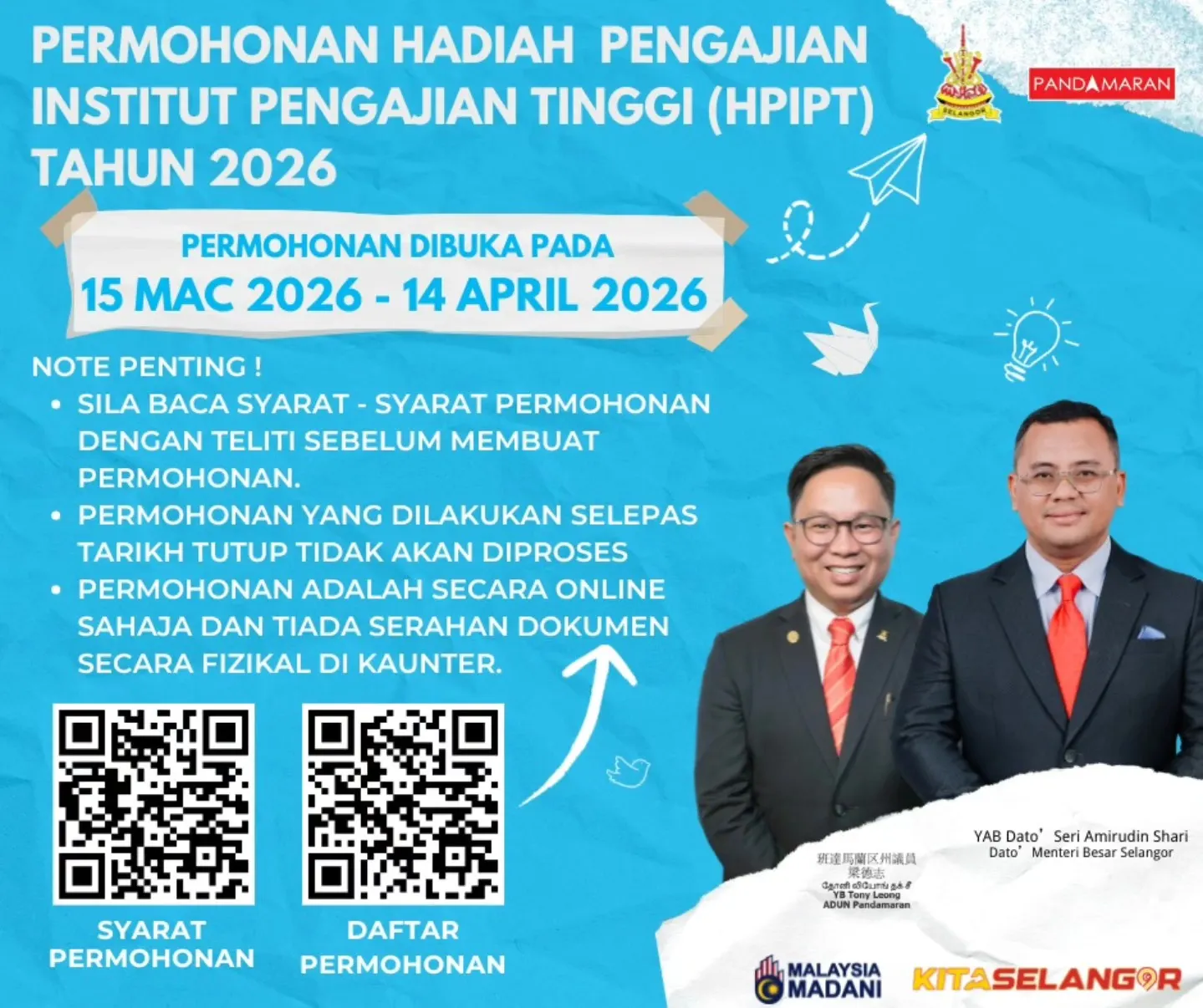 (莎阿南16日讯)雪兰莪州的大专生注意,你的福利来啦!2026年雪州大专深造奖励金(HPIPT)开放申请,凡家庭收入少于5000令吉的高等学府新生请把握机会!