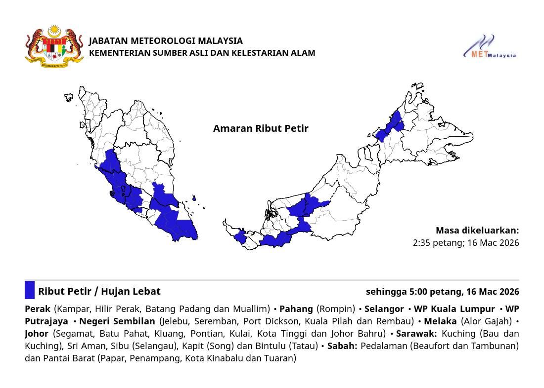 (莎阿南16日讯)整个雪兰莪、吉隆坡、布城,以及多个州属预计迎来雷雨天气,直至今日下午5时。