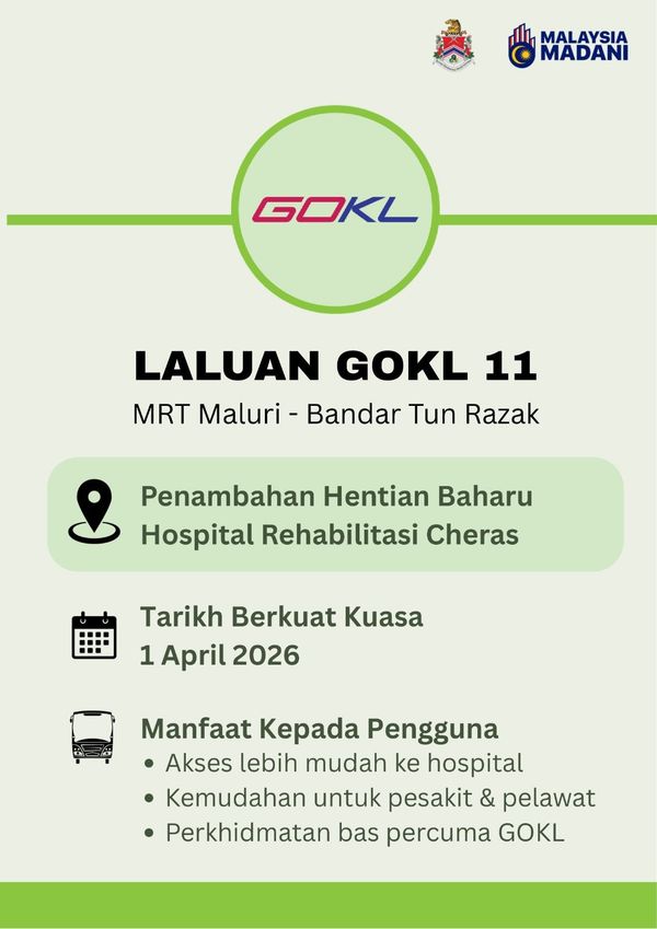 (吉隆坡18日讯)吉隆坡GO KL免费巴士路线从4月1日起在蕉赖康复医院(HRC)增设新靠点,方便病患与年长者乘搭免费巴士前往医院。