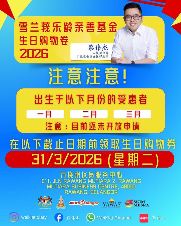 (莎阿南25日讯)万挠人注意!凡在1月至3月出生的雪兰莪乐龄亲善基金(SMUE)和雪州特殊人士亲善基金(SMIS)会员,必须在3月31日前,领取生日购物券。