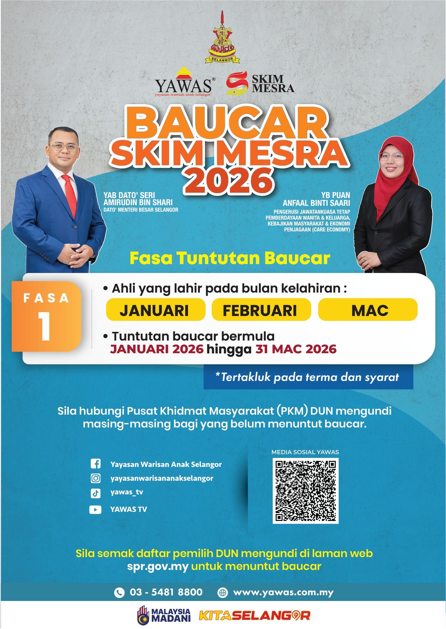 贴文说,SMUE和SMIS可在31日前,到各自的选区服务中心领取购物券,会员可透过网址: mesra.yawas.com.my,查询各自选区的州议员和服务中心地址。