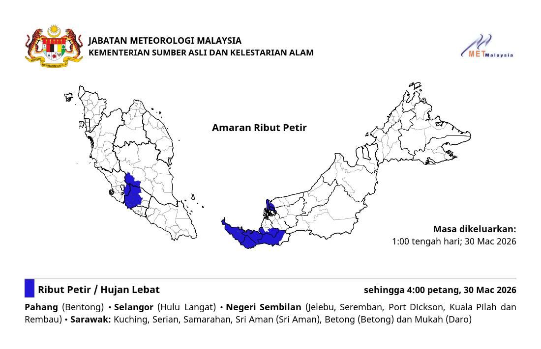 马来西亚气象局官方脸书于今日下午1时更新天气预告时表示,彭亨、森美兰和砂拉越则是局部地区会有雷雨,直至下午4时。