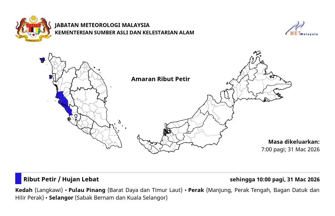 (莎阿南31日讯)上班中的各位注意咯!雪兰莪州2个县区将迎来雷雨直至今日上午10时。