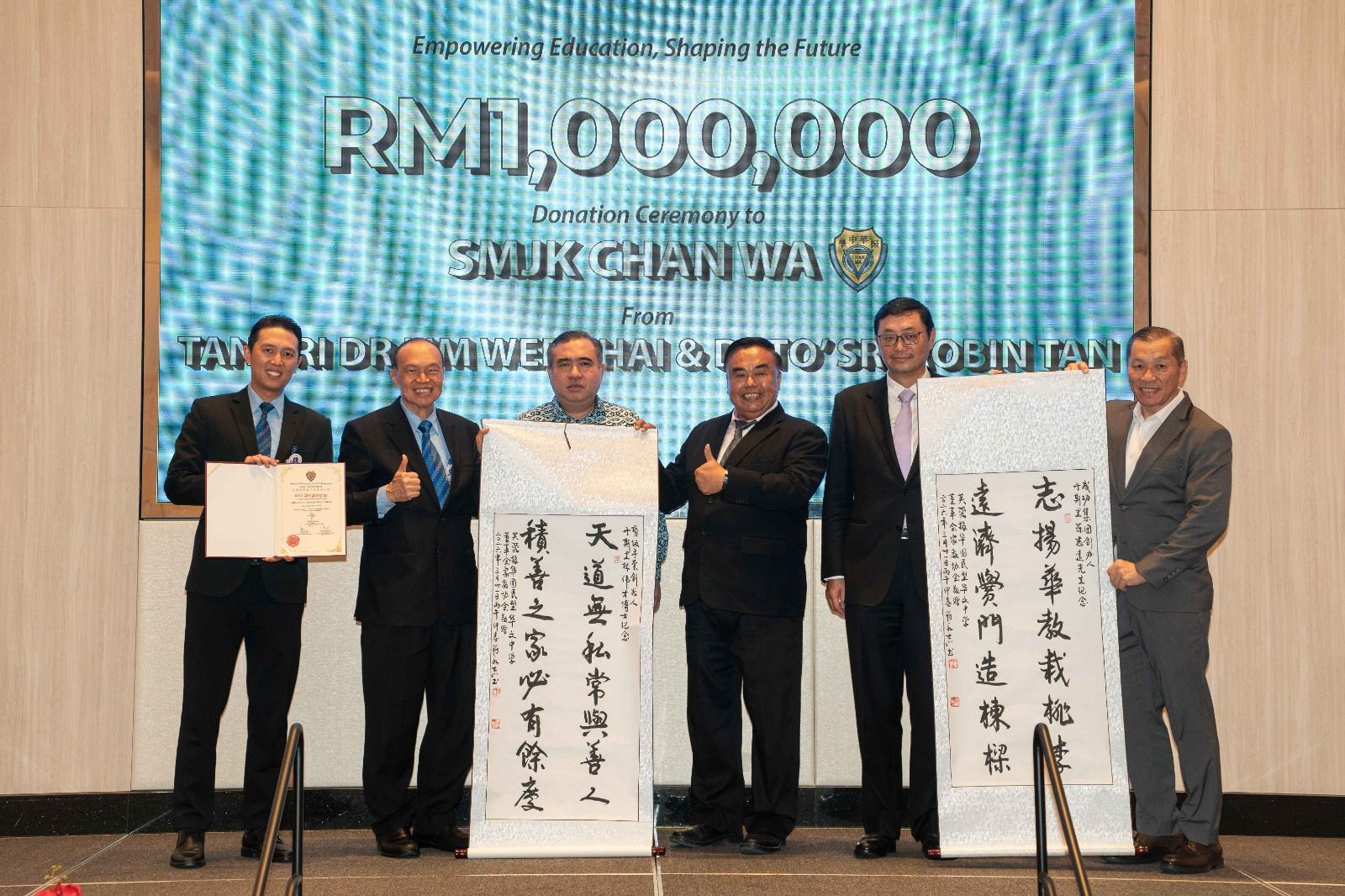 (莎阿南1日讯)顶级手套集团创办人兼执行主席丹斯里林伟才和成功集团创办人丹斯里陈志远联合捐出100万令吉予森美兰州芙蓉振华国民型华文中学,作为兴建全新的行政教学大楼基金。