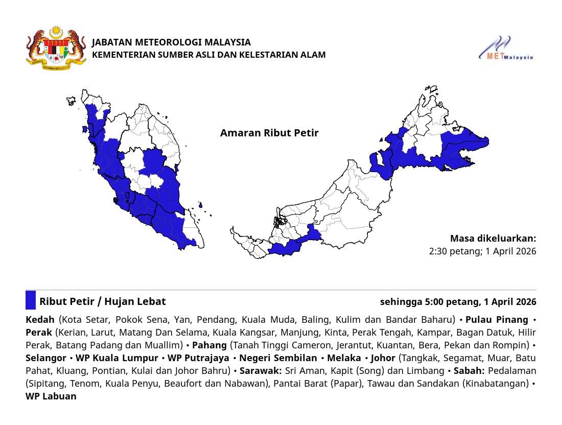 马来西亚气象局于今日下午2时30在官方脸书更新天气预报时表示,整个雪州、吉隆坡、布城、森美兰、马六甲和纳闽会受到恶劣的天气影响。