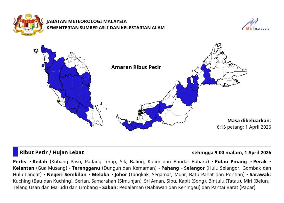 (莎阿南1日讯)天气持续不理想!马来西亚气象局预测国内多个州属继续迎来雷雨天气,直至今日晚上9时。